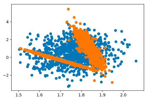 plt.scatter(*y.T)The following two distribution of points (one in blue and one in orange) have the same means standard deviations, and correlation.