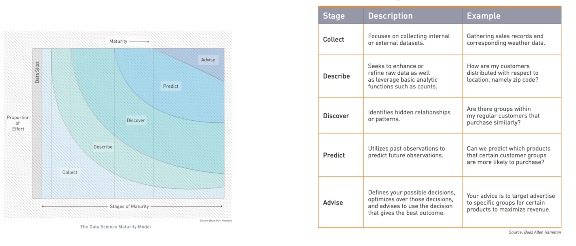 We use the Data Science Maturity Model as a common framework for describing the maturity progression and components that make up a Data Science capability. This framework can be applied to an organization’s Data Science capability or even to the maturity of a specific solution, namely a data product. At each stage of maturity, powerful insights can be gained and processes can improved or automated.