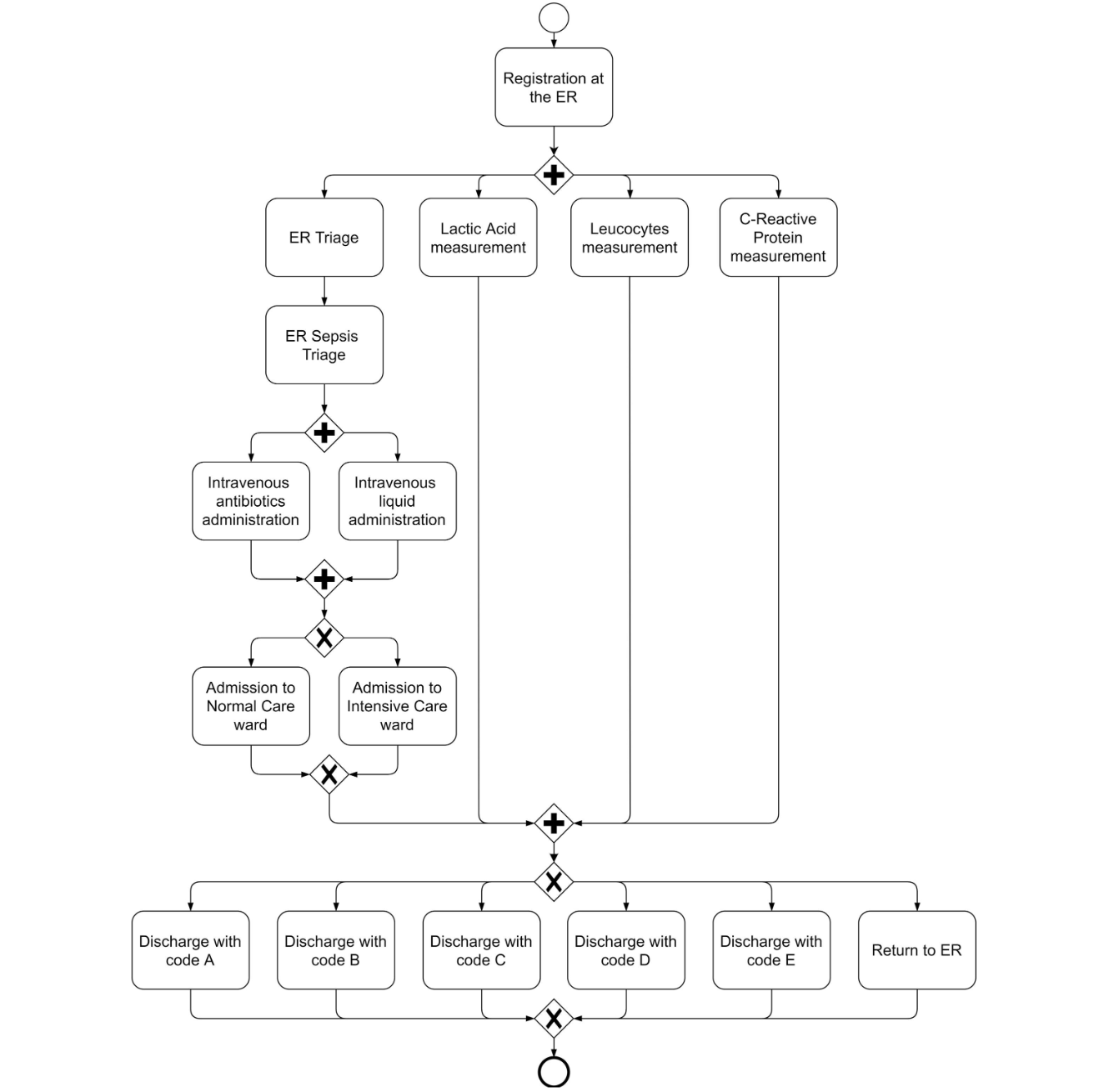 In a healthcare context the trajectory of a patient from arrival in the emergency ward to the admission to a hospital ward and up to the discharge can be seen as a process (sometimes also known as careflows). At a high-level, medical diagnosis process consists of gathering data, classifying and diagnosing a specific problem and suggesting a particular course of treatment. The notion of a clinical process (often also referred to as a careflow) underpins the practice of medicine. Clinical pathways are care plans that attempt to standardise clinical or medical treatment processes. The process data representing such pathways, is often recorded in hospital information systems and clinical data warehouses. i.e Often the execution of such a processes is supported by information systems. For example, the hospital may record medical information such as symptoms, the condition upon arrival of the patient, and the results of blood tests. Moreover also logistical information are recorded such as the movement of patients between wards and different types of discharge.
