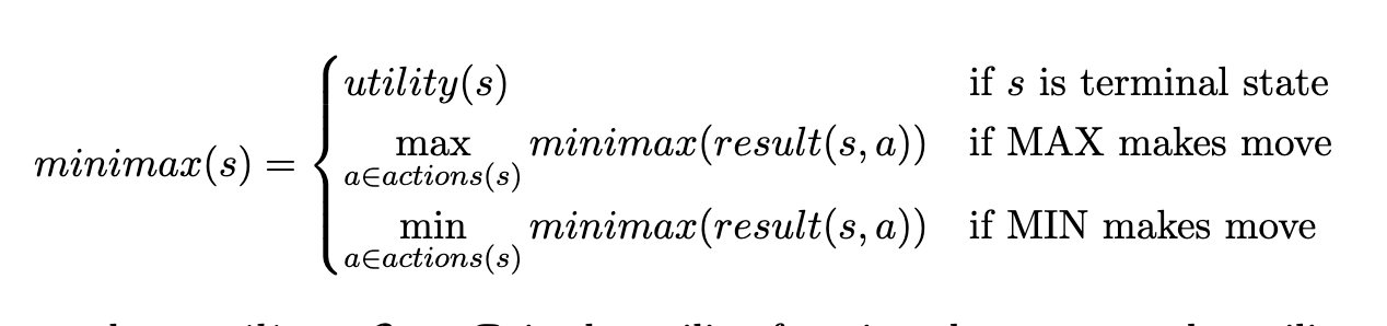 state (s), $result : \mathcal{S} \times \mathcal{R} \rightarrow \mathcal{S} $ returns the next state if a particular action is taken by the player, and (action : \mathcal{S} \rightarrow \mathcal{A^{*}}) returns a set of legal actions that are available to the player at the given game state (s). Once we know the minimax value, the optimal choice for a player in a certain state can be determined by simply selecting the action that leads to a state with the highest minimax value.