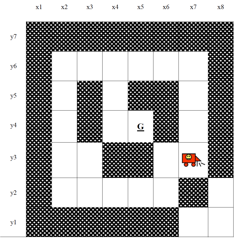 The maze is of size 8 x 7. An intelligent robot is stationed at position (x7,y3). There are walls in this maze (the gray colored grid points). The robot can move in a horizontal or vertical direction (no movement in the diagonal direction is allowed) but must not cross grid points which are marked as a wall, and must not visit grid points that the robot had already visited before (each grid point can be visited at most once). The grid point (x5,y4) is marked to be the goal (the target) for the robot.