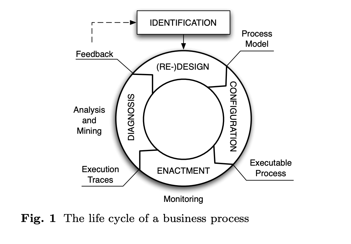 Process Identification/(Re)design: In process identification, after requirement analysis, process models are designed using a suitable modeling language. Existing models can be further refined/improved based on insights gathered in the previous cycle.