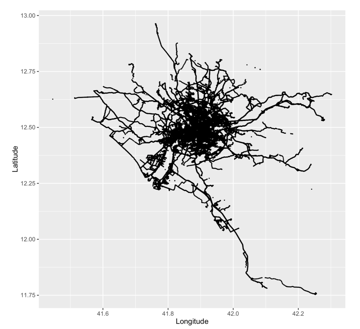 Since they are a a series of chronologically ordered points, they represent taxi movement traces. i.e spatial trajectory generated by moving taxis in Rome.