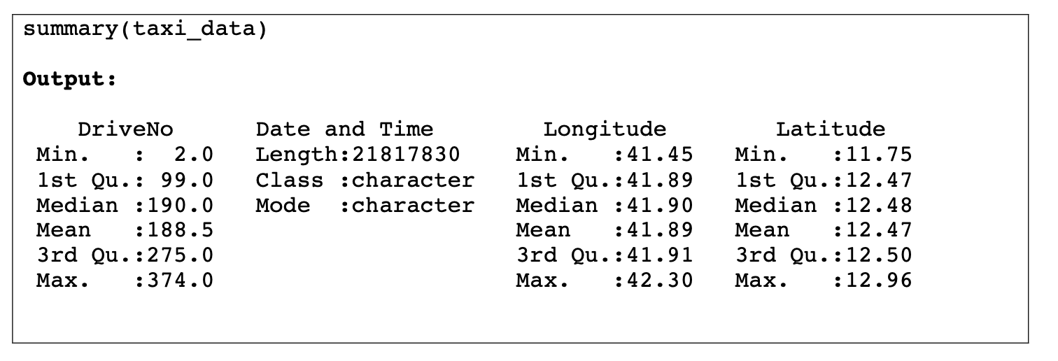 taxi_data = fread(file.choose(), header = T, sep = ',',data.table=FALSE)Exploring the data: