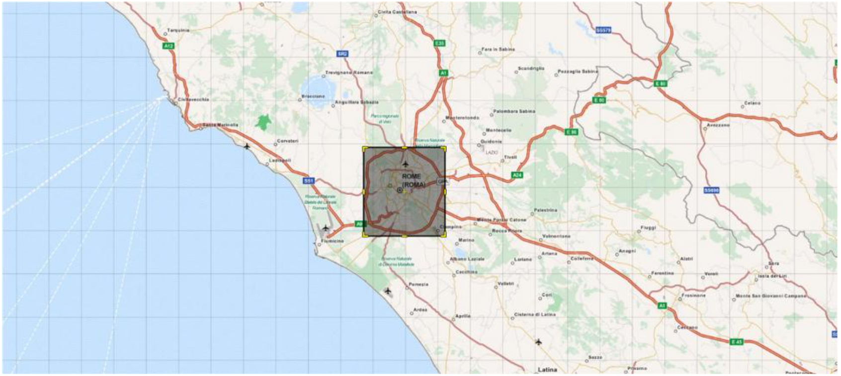 A bounding box was created(as shown in Figure 1) with the below values. The bounding box is based on rome city coordinates from google maps.