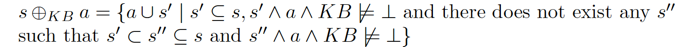 This shows there will be many possible non-deterministic outcomes of a action. The expression tell us that in the resulting state the effects of the last action will be there along with a state set that is consistent with the effects of the action we took and the knowledge base. Resulting set would be the Effects of the current action combined with maximal subset of current state s that is consistent with the effect of the action.