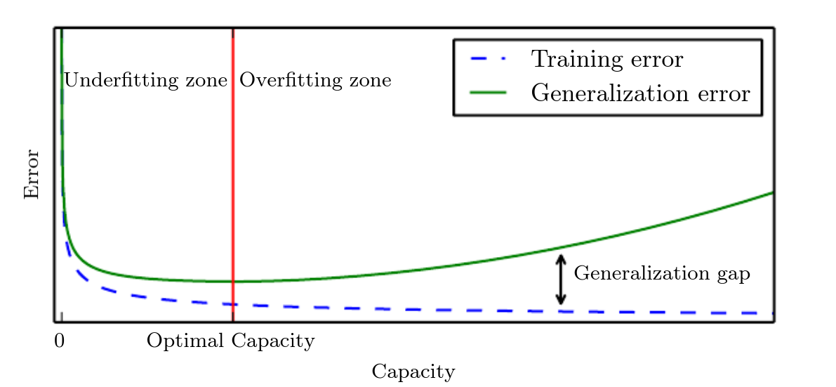 2nd Figure: Typically, training error decreases until it asymptotes to the minimum possible error value as model capacity increases (assuming the error measure has a minimum value). Generalization error has a U-shaped curve as a function of model capacity. In the 2nd figure, on the left end of the graph, training error and generalization error are both high. This is the underfitting regime and as we increase capacity, training error decreases, but the gap between training and generalization error increases. Eventually, the size of this gap outweighs the decrease in training error, and we enter the overfitting regime, where capacity is too large, above the optimal capacity.