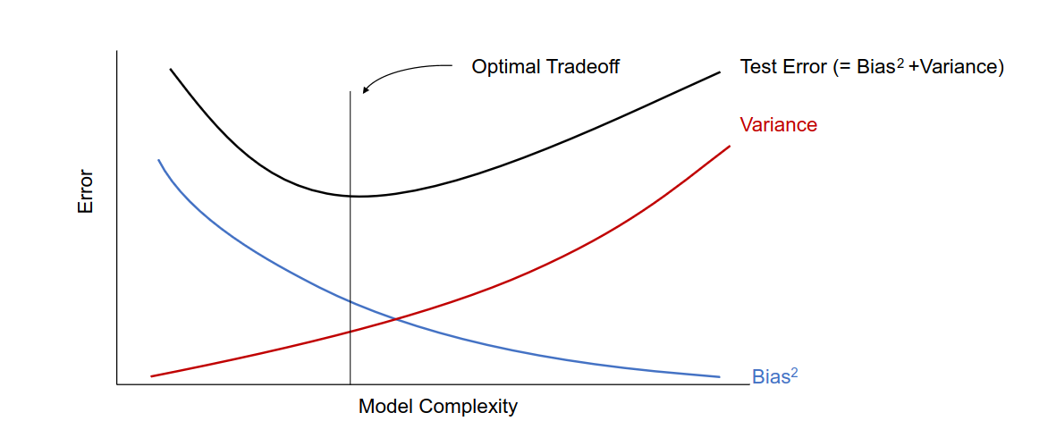 In first figure, The test error can be decomposed as a summation of bias and variance. As model capacity increases, bias tends to decrease, while variance tends to increase. This means that the test error will have a convex curve as the model complexity increases, and in practice we should tune the model complexity to achieve the best tradeoff. The optimal model is the one that balances the bias and variance, leading to low error on both the training and testing data.